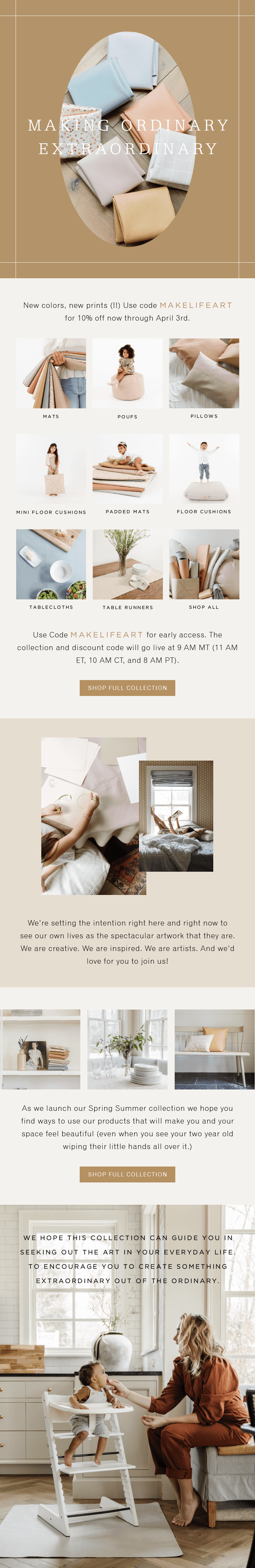 The launch newsletter aimed to make shopping the SS21 collection effortless. To keep it highly navigable, I included clear links to each product type as well as the full collection page. The email featured rich lifestyle imagery to help customers imagine the pieces in their own homes and feel inspired to bring a little more art into their everyday routines.